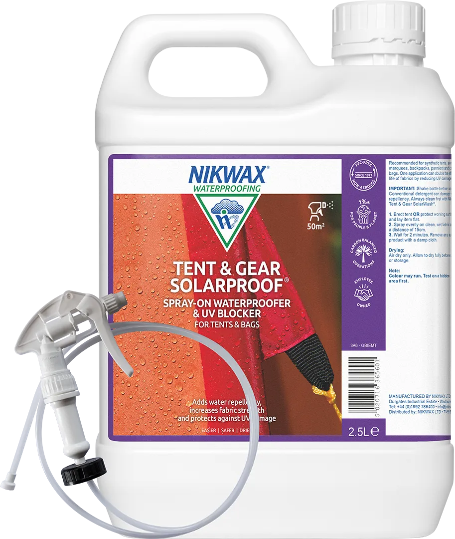Nikwax Tent & Gear SolarProof® protects the entire fabric, from the effects of both UV and water.